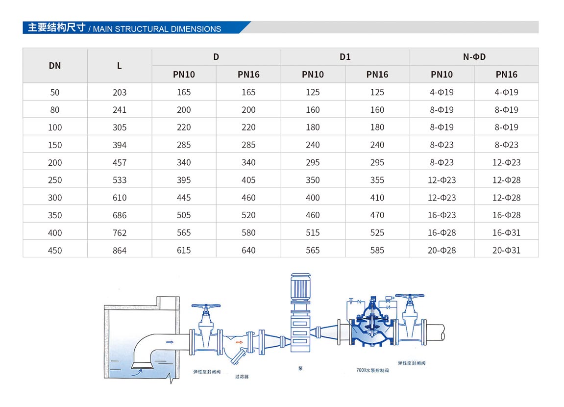 700X水泵控制閥,是一種安裝在高層建筑以及其他給水系統(tǒng)的水泵出口處,防止介質(zhì)倒流的逆止類閥門。當(dāng)水泵即將停止供水前,閥門先行緩幔關(guān)閉90%左右,防止突然停泵而產(chǎn)生的水錘和水擊聲:當(dāng)水泵完全停止后,閥門再完全關(guān)閉,防止泵出的水回流,有效地保護(hù)水泵,免受回流的沖擊而產(chǎn)生反轉(zhuǎn)。該產(chǎn)品是水泵出口必不可少的保護(hù)裝置。閥門呈流線型設(shè)計(jì),通過(guò)電磁閥的導(dǎo)控實(shí)現(xiàn)準(zhǔn)確的啟閉,使用安全可靠,有效地防止水錘和水擊聲,使用壽命長(zhǎng),安裝、維修方便。